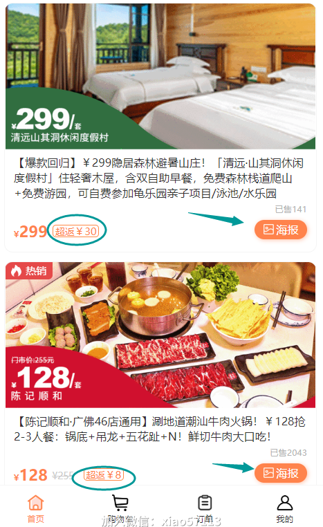 注册后登录旅划算商城后就可以看到商品价格有“返¥30”的字样,旁边的海报按钮就可以获取自己专属的分享海报,如图: