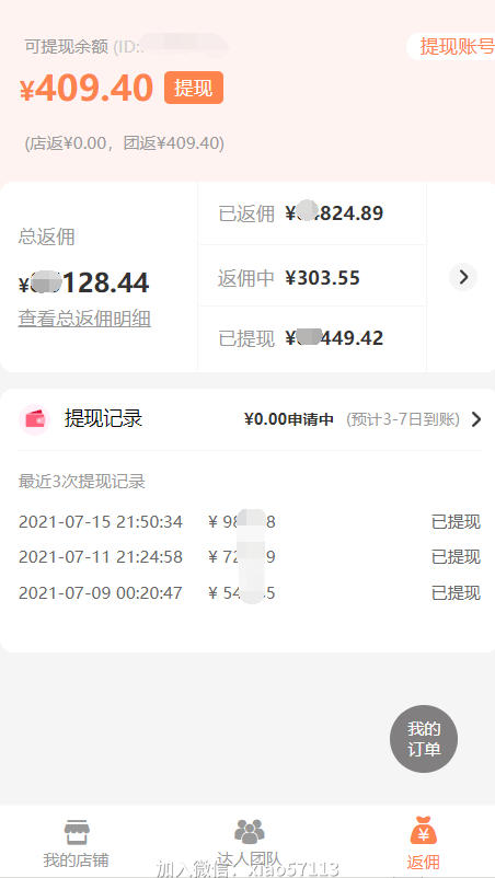 那佣金还可以在哪里看和提现呢?点击底部菜单“进入商城”-“我的”-“返佣”就可以看到所有的佣金,也可以查看明细和提现!如图: