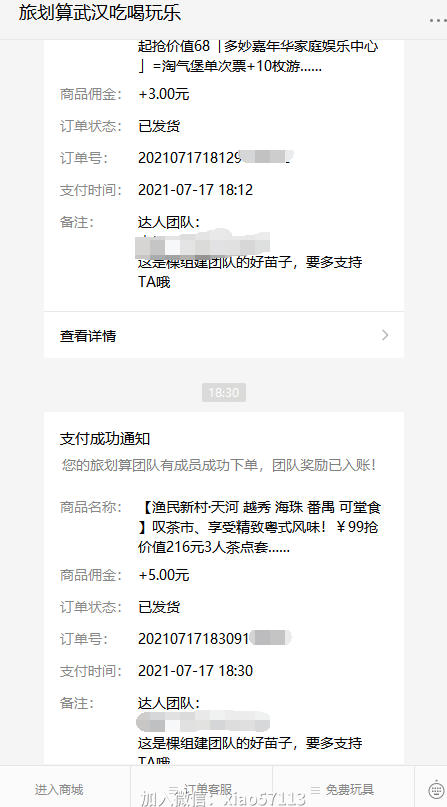 当自购和分享的商品有人购买时,一般会在旅划算公众号(注册时让关注的公众号)上有消息提醒,如图: