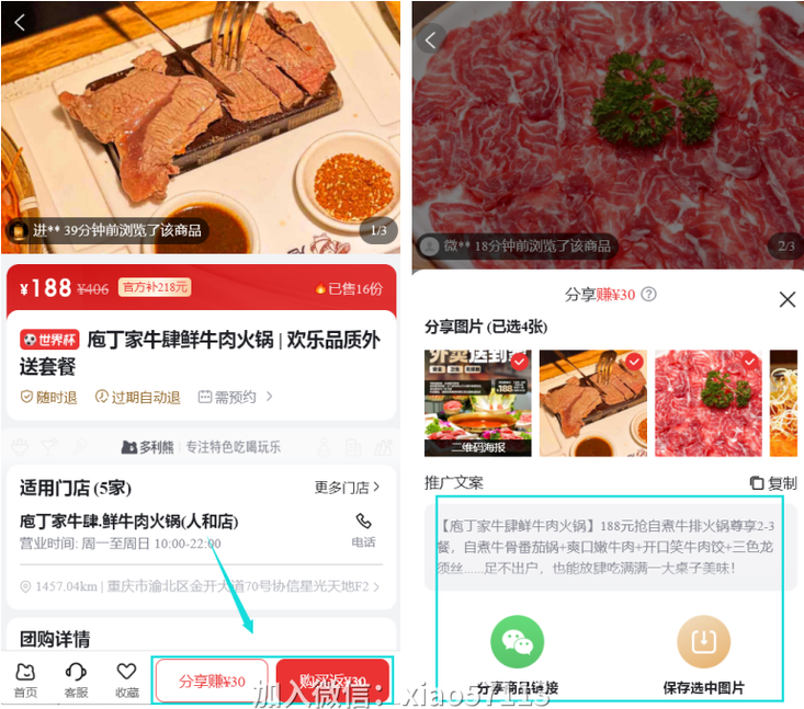 点击想要的商品,自购点击底部菜单【购买返¥】,分享赚佣点击底部菜单【分享赚¥】直接点击微信分享或保存海报图片和复制文案在分享到群、朋友圈等,如下图
